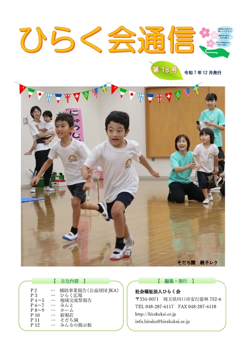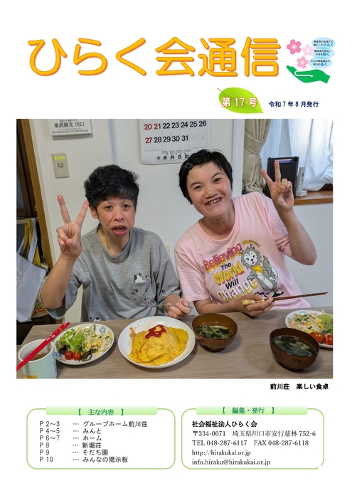 社会福祉法人ひらく会は、障害を抱えた人々が地域社会の中で自分らしく暮らし続けることのできる未来を目指して、「地域での暮らしをひらく」「明るい未来を開く」「川口市の障害者福祉の明日を拓く」という想いを込めて『ひらく会』という名称のもとに事業運営を行っております。